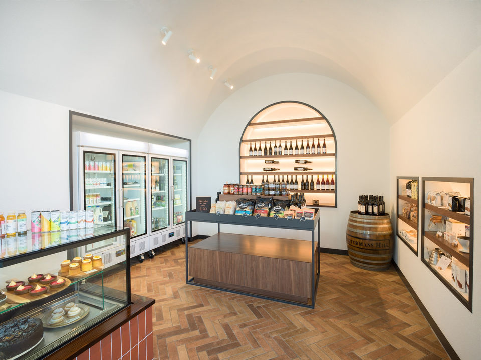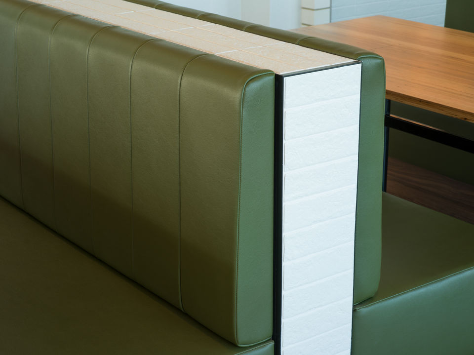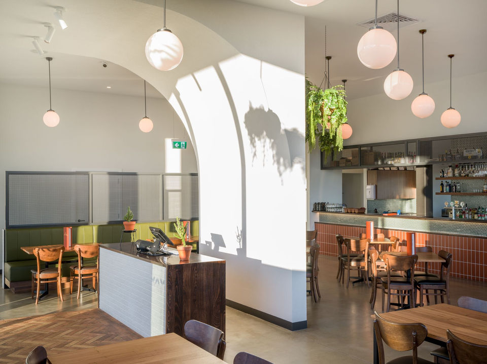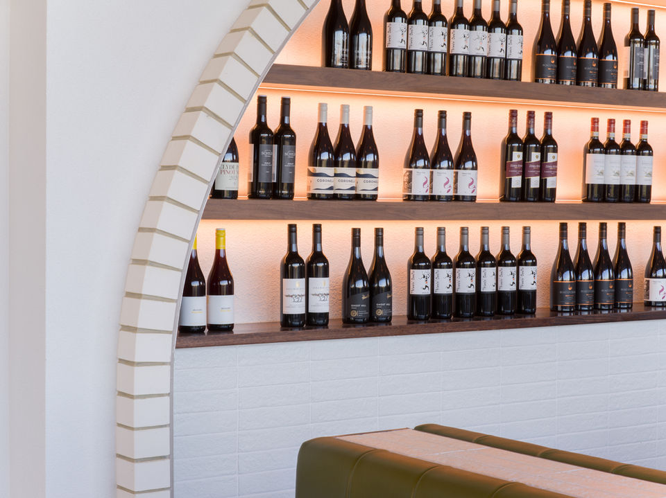 Aintree food and wine has a contemporary feel with its deep green leather booths and couches and a mix of low tables and chairs. Filled with natural light, curved archways and wine displays, the restaurant features textured painted walls and uses an interior palette that is both clean and simple. White paired with deep green and hues of terracotta can be spotted throughout the venue that help to create an earthy natural feel that is both calming and relaxing.