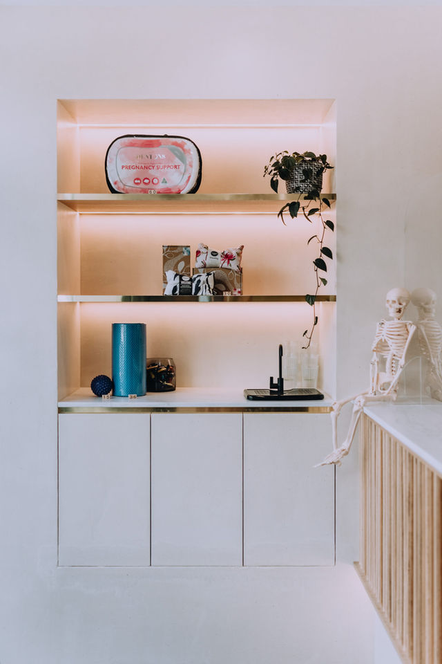 Timber finishes are paired with textured walls in soft neutral skin tones establishing a modern yet welcoming atmosphere far from the medical settings we’ve become accustom to. Soft lighting illuminates display shelves and adds warmth to the reception area where clients can unwind and feel safe and calm in an aesthetically pleasing and relaxing environment while awaiting their treatment.