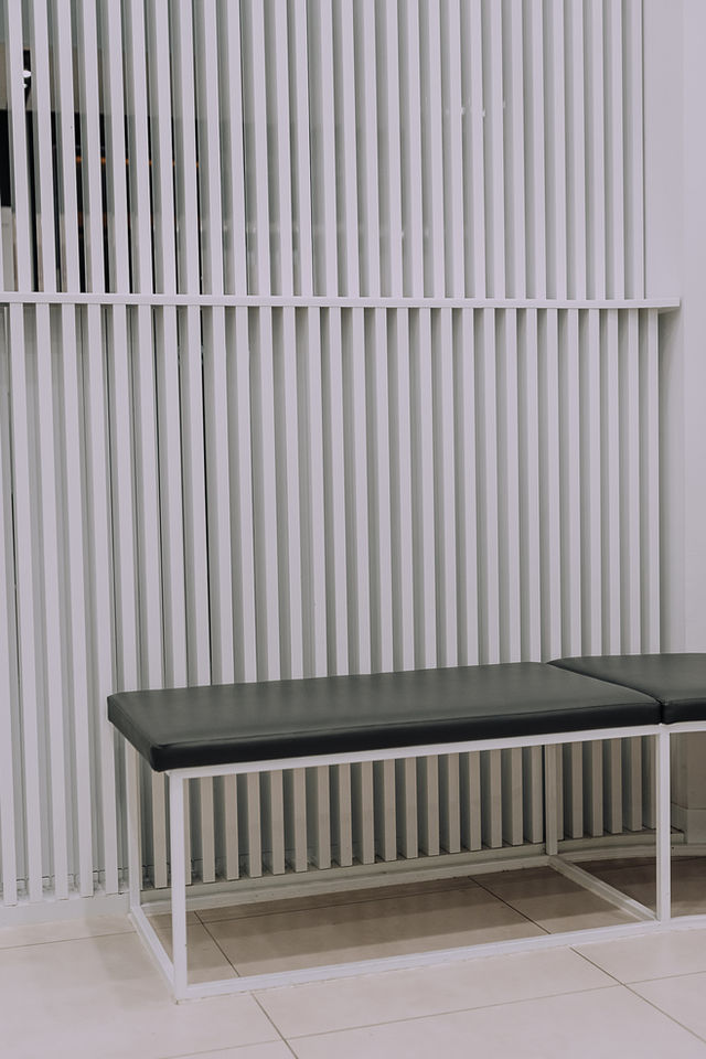 Ample light, white walls and soft textures compliment the blue medical gowns which complete the brand’s image.