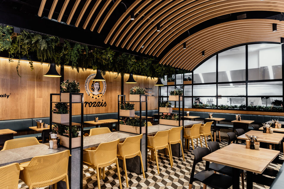 With a high volume of pedestrian traffic it was vital that the food display presented on the mall line. Corso Interior Architecture created a prominent back drop with the inclusion of the arc baffled ceiling sculpture. The sculpture mimics the semi open kitchen screen & provides the focal point of the interior. The ceiling sculpture assists with sound reverberation.