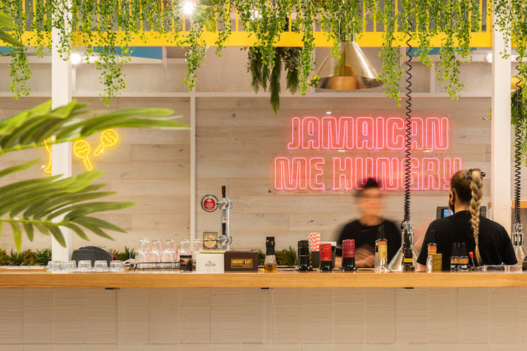 The interior architecture concept is based around the ‘island’ structure featuring a bar and cookline, with seating wrapping around the island, making any seat as fun and social as the next. The interior comprises of neon wall graphics, beach huts and a sandy influenced floor, adding a tropical twist to the décor.